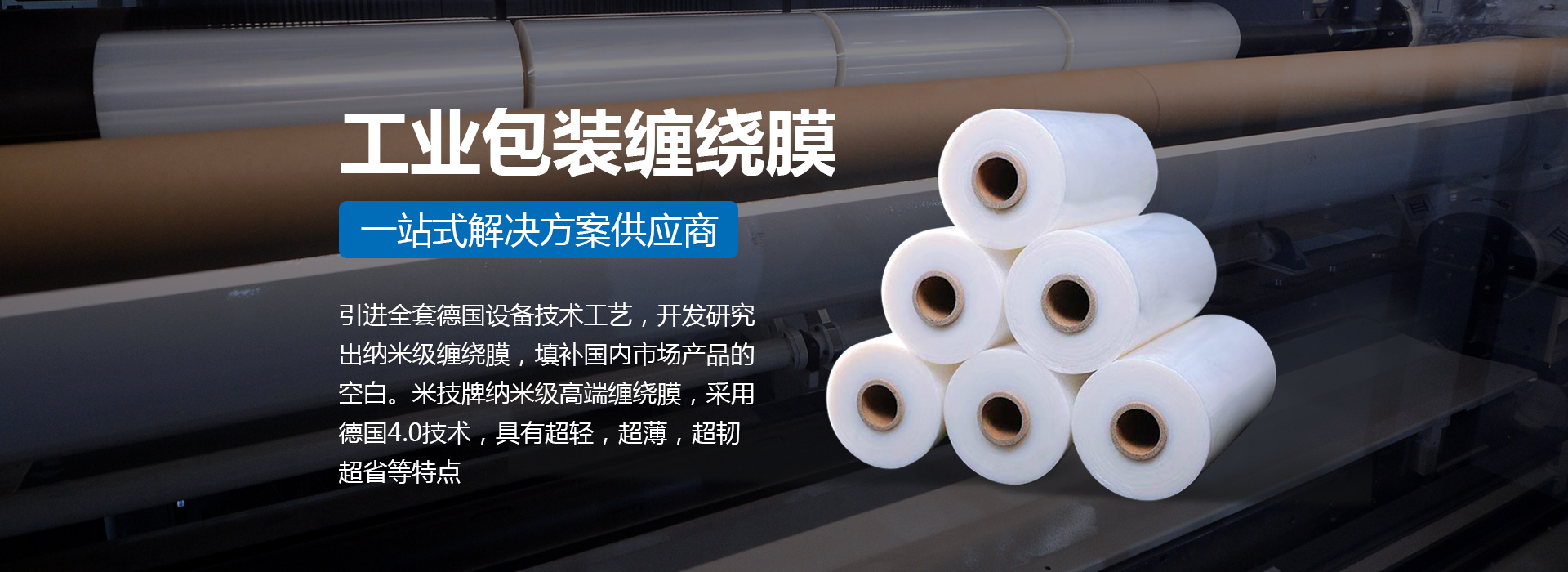 引進全套德國設備技術工藝,開發研究出納米級纏繞膜,填補國內市場產品的空白。米技牌納米級高端纏繞膜,采用德國4.0技術,具有超輕,超薄,超韌,超省等特點。